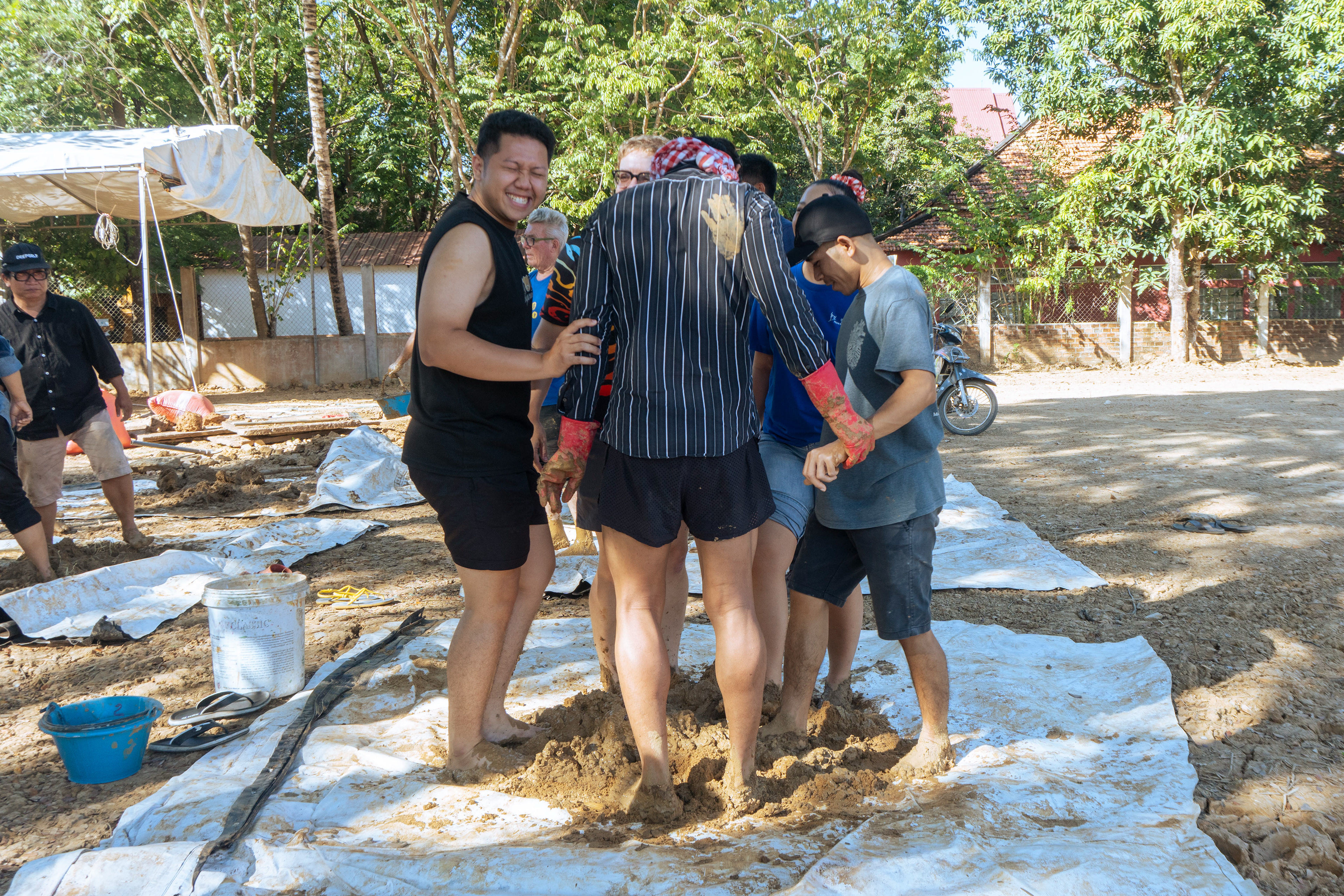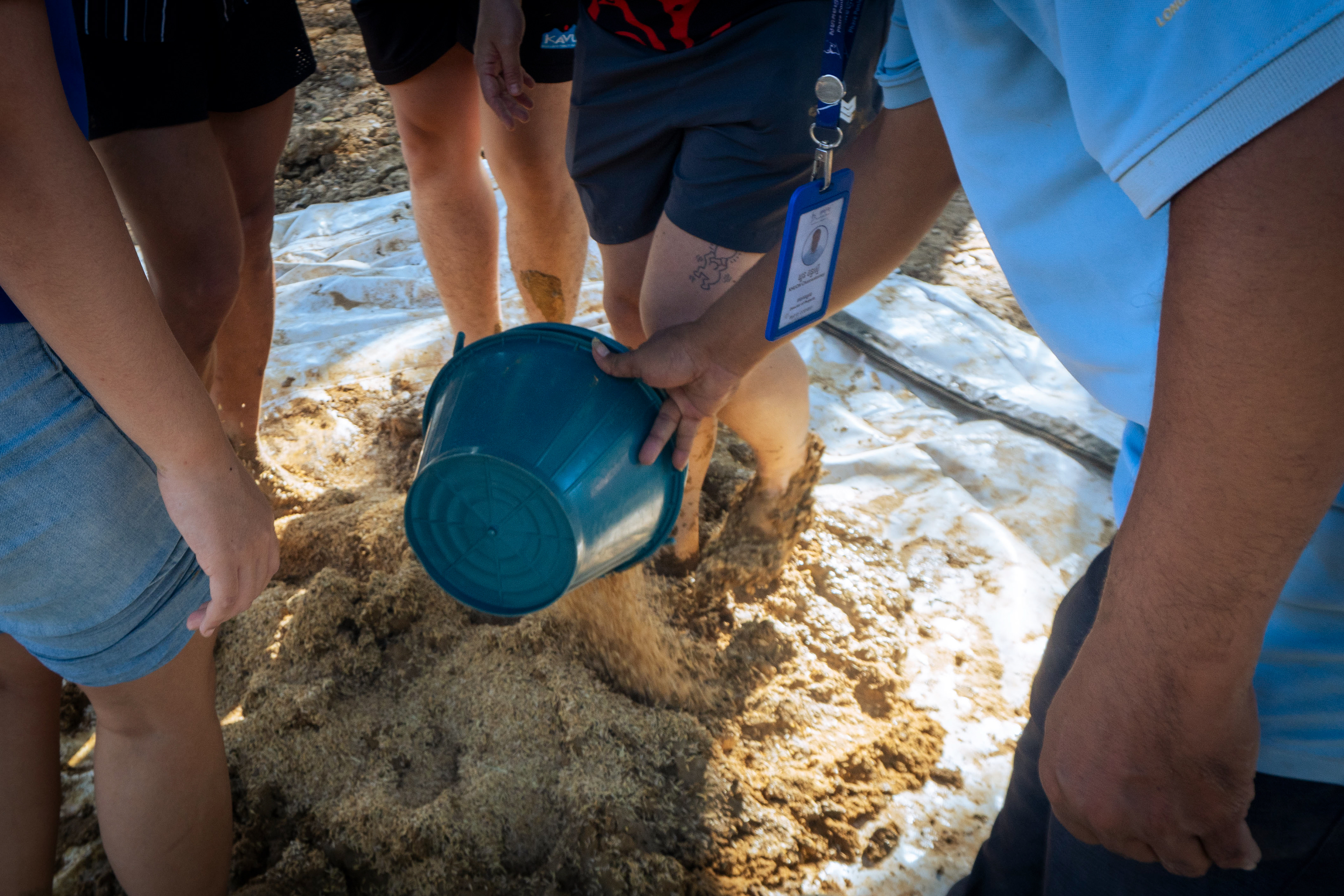 One challenge we encountered was that all the soils were quite wet, making it difficult to break down large lumps. Although it is usually recommended to dry-mix the ingredients, we adapted our method to site conditions. We decided to pre-soak the soil in a small pit, allowing the clay-rich soil to soften and making it much easier to break apart during mixing.