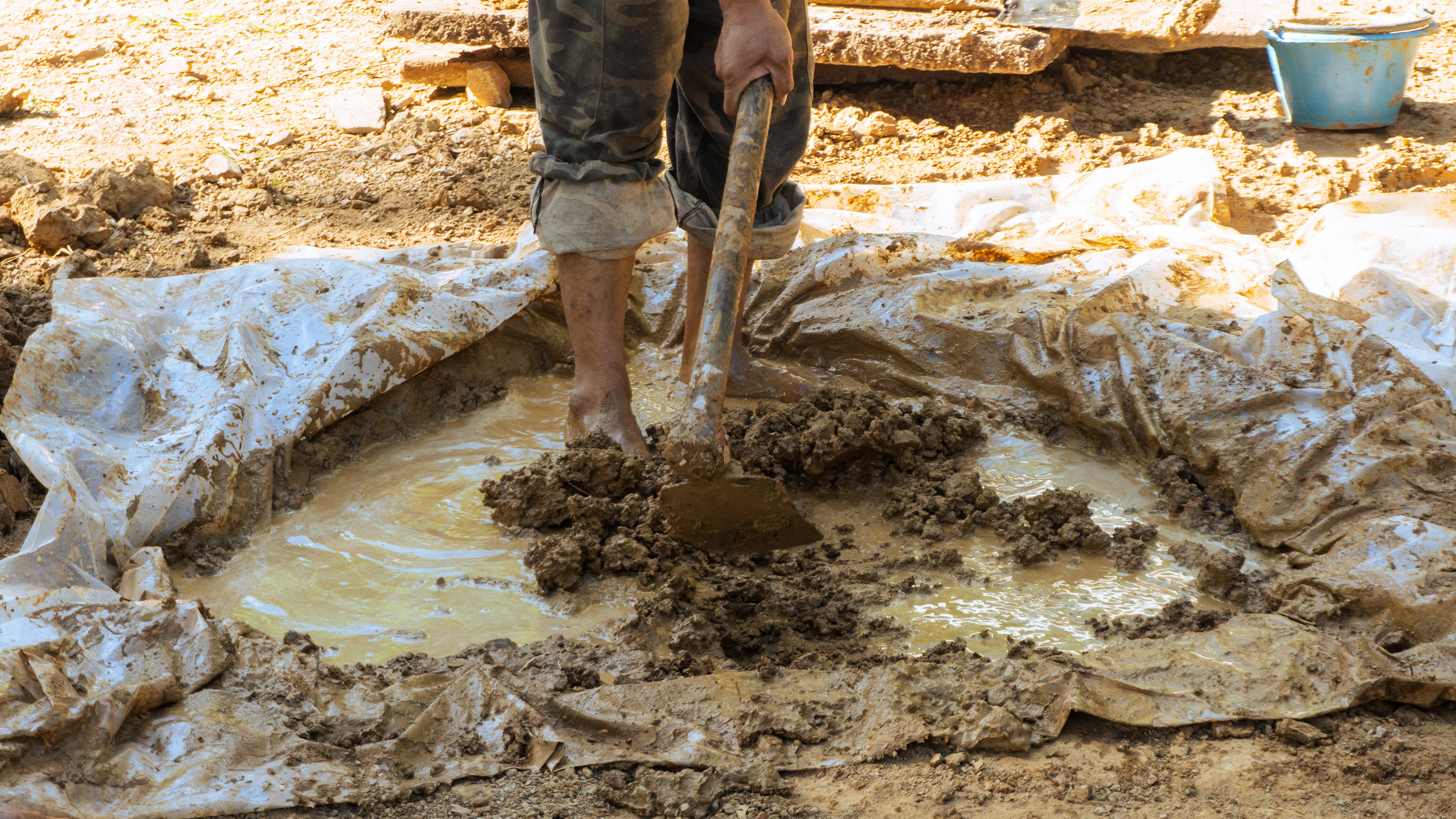 Mixing can be done by hand or with your feet, using plastic sheets to help gather the mix toward the centre.