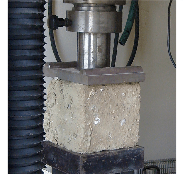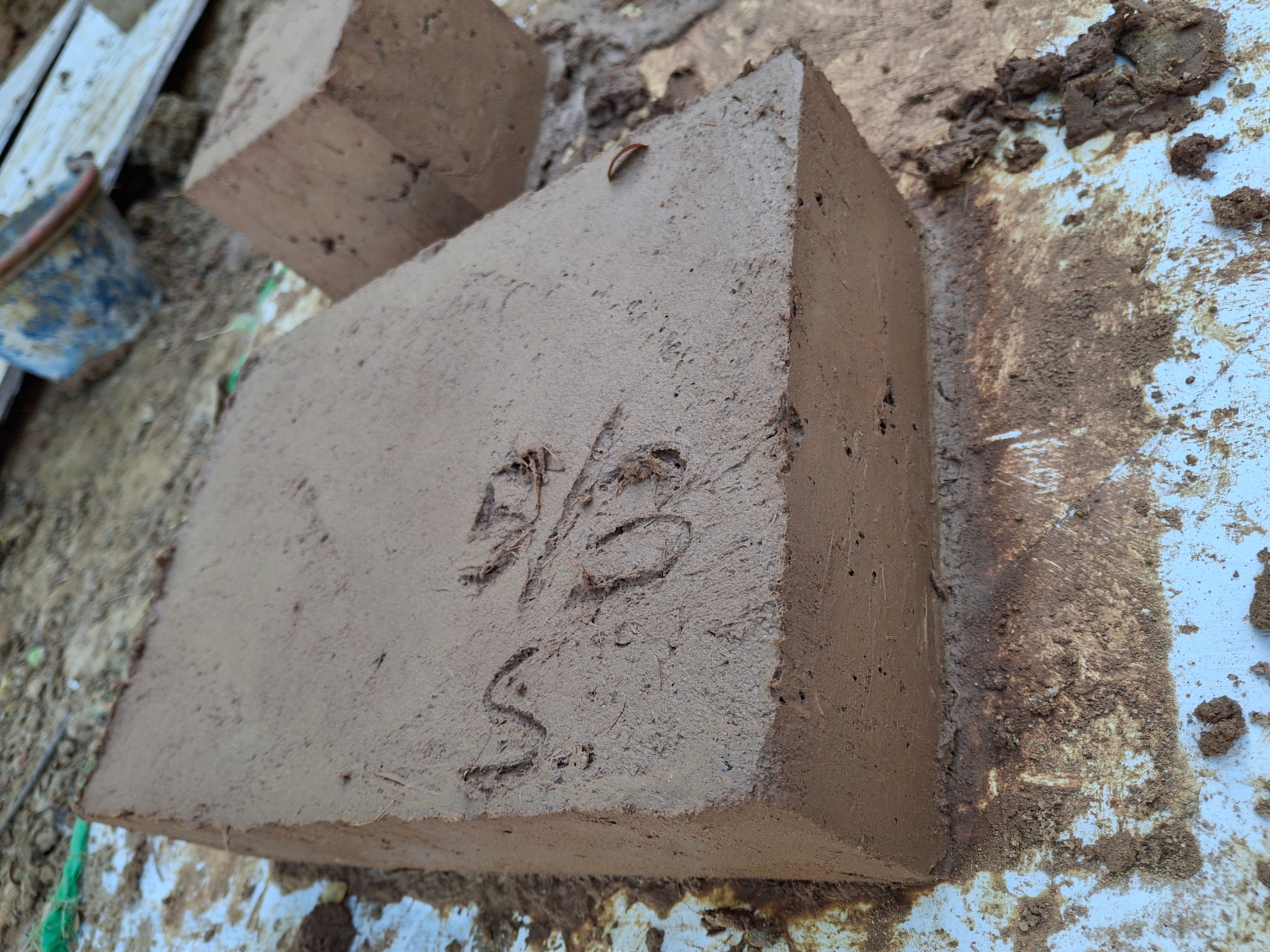 We produced two block sizes: one matching the brick size intended for the building and one standard cube, sized according to laboratory requirements, to be sent for compression and bending strength tests.