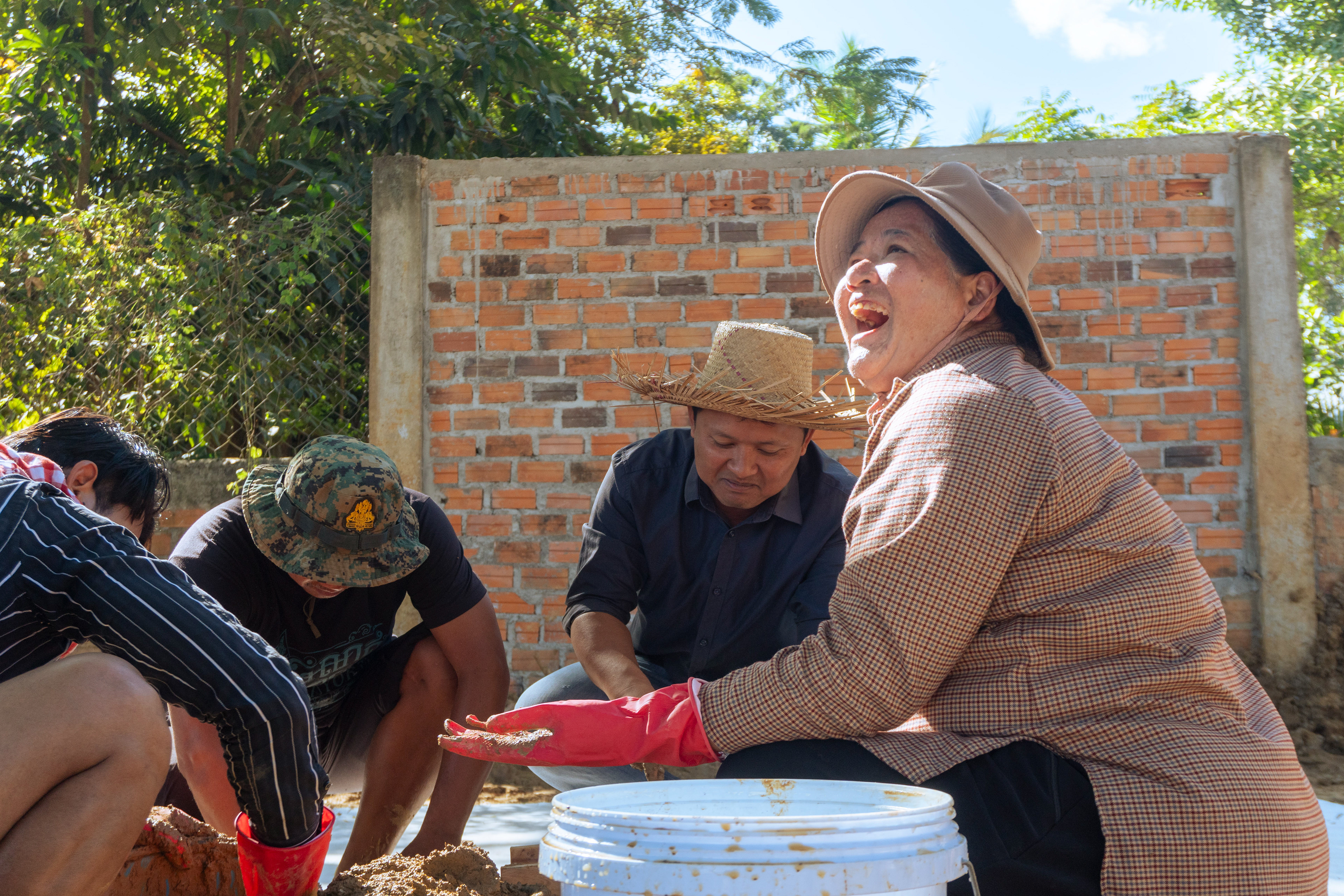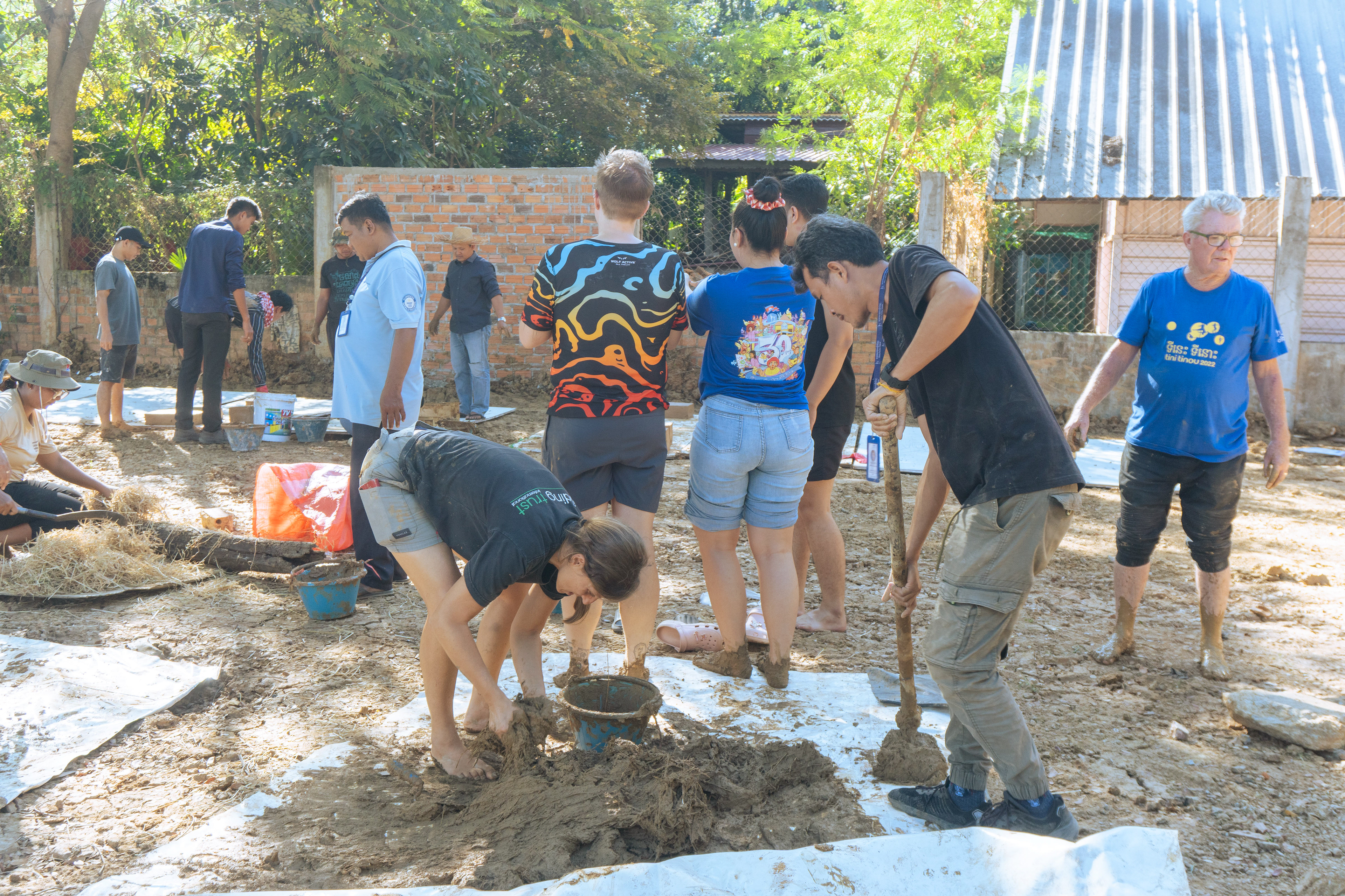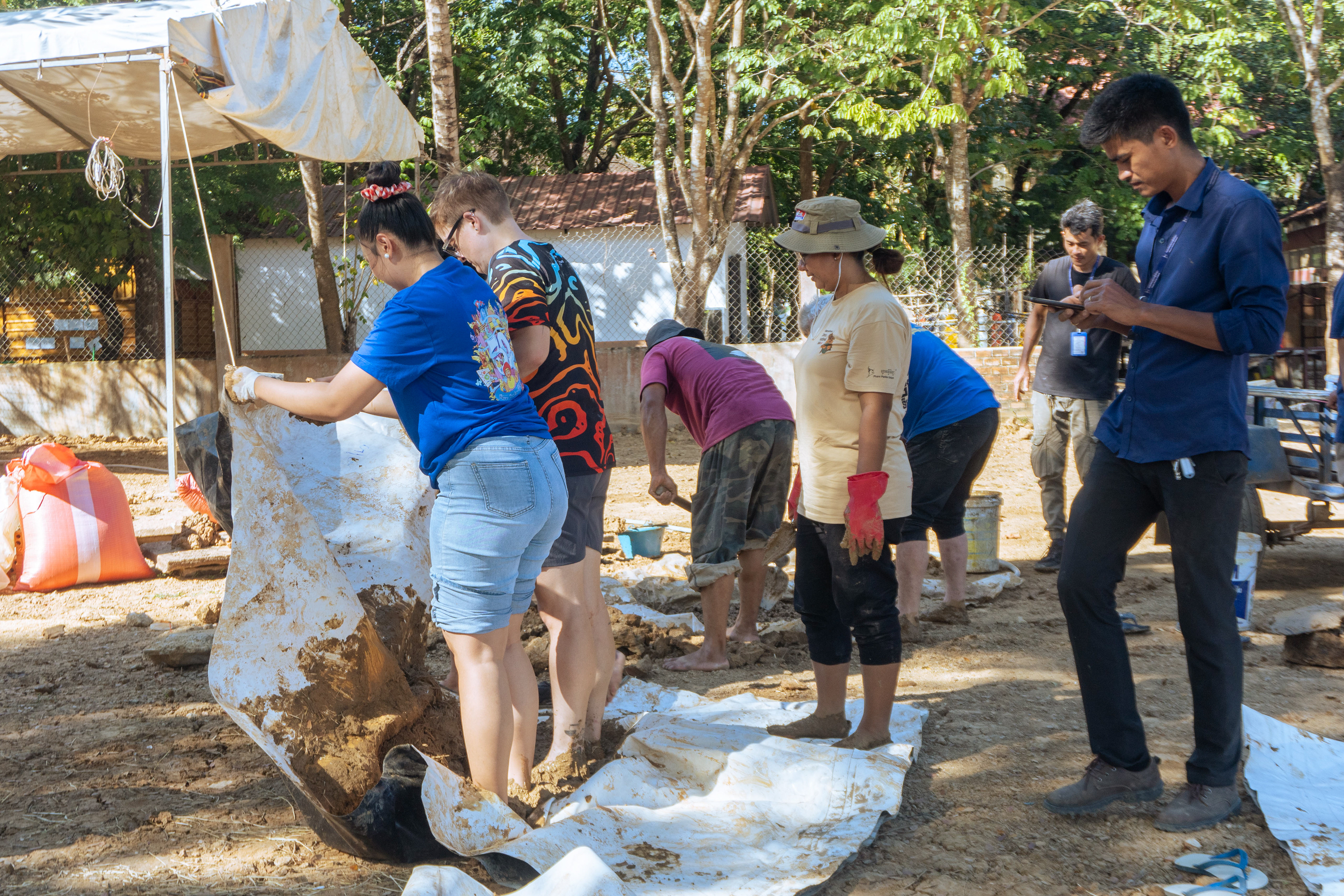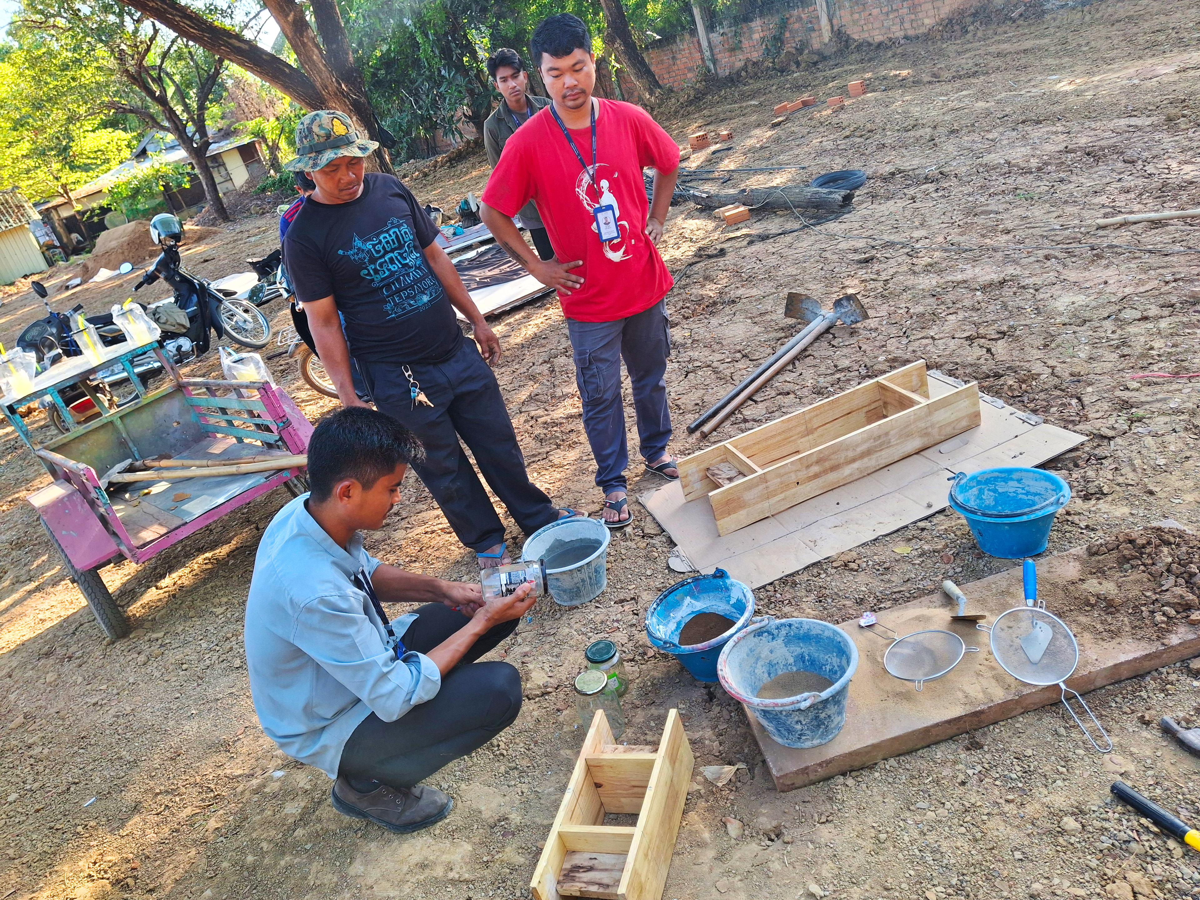 One challenge we encountered was that all the soils were quite wet, making it difficult to break down large lumps. Although it is usually recommended to dry-mix the ingredients, we adapted our method to site conditions. We decided to pre-soak the soil in a small pit, allowing the clay-rich soil to soften and making it much easier to break apart during mixing.