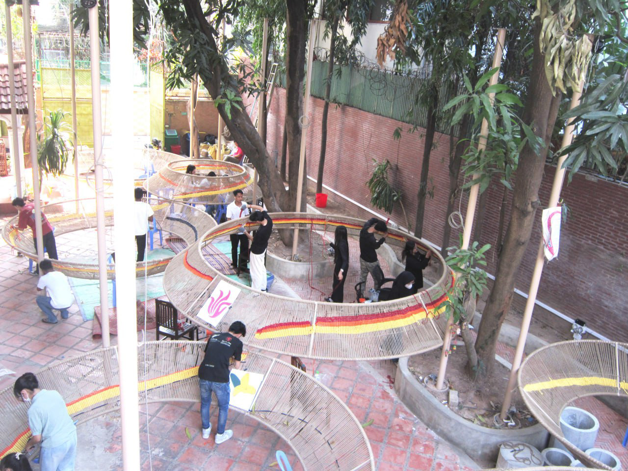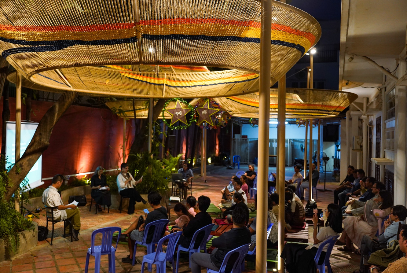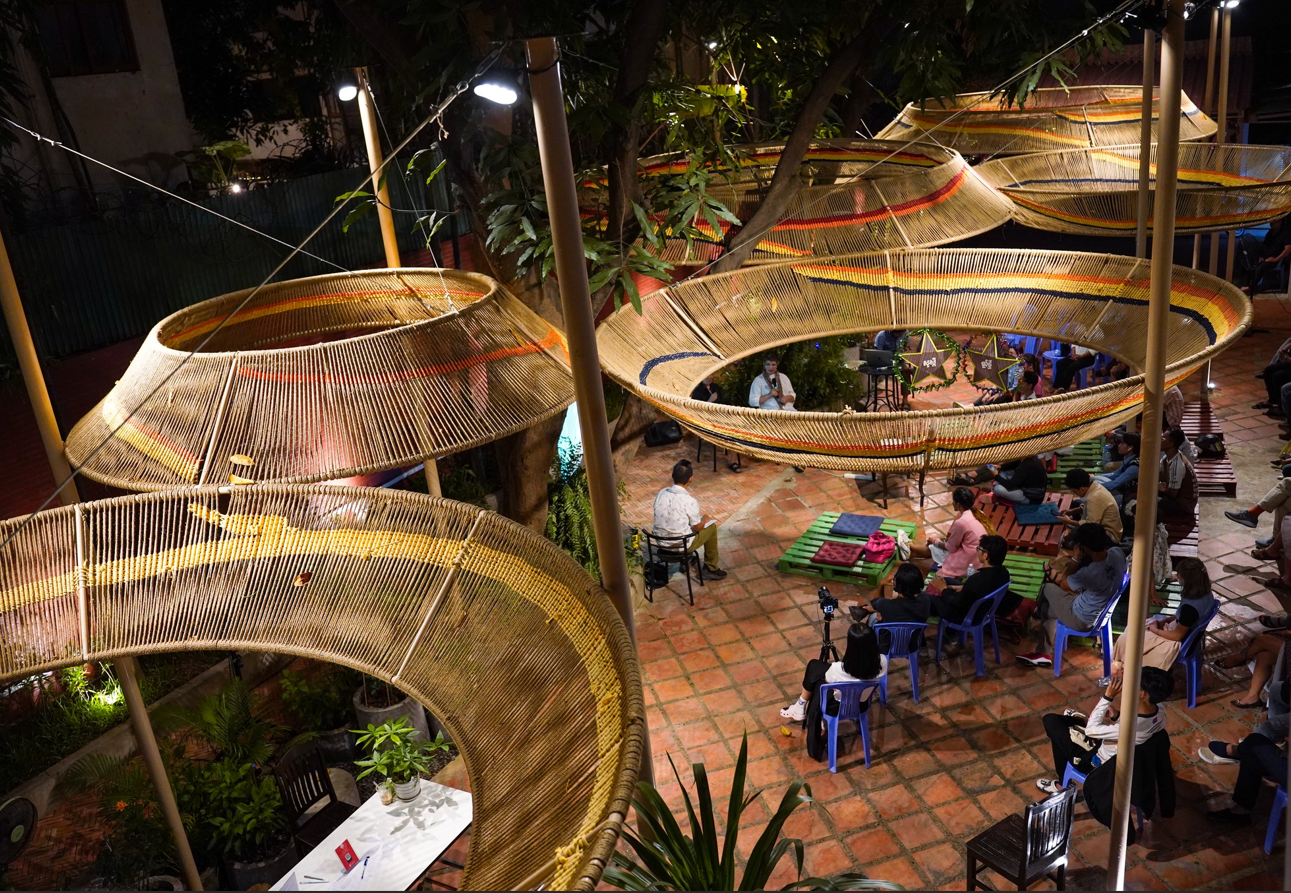 The Connected Canopy is more than a structure – it is the result of a deeply collaborative process rooted in community engagement and vernacular wisdom. Designed for the courtyard of Cambodian Living Arts in Phnom Penh, this project brings together artists, musicians, architects, and local craftspeople to co-create a space that reflects shared values and lived experiences.